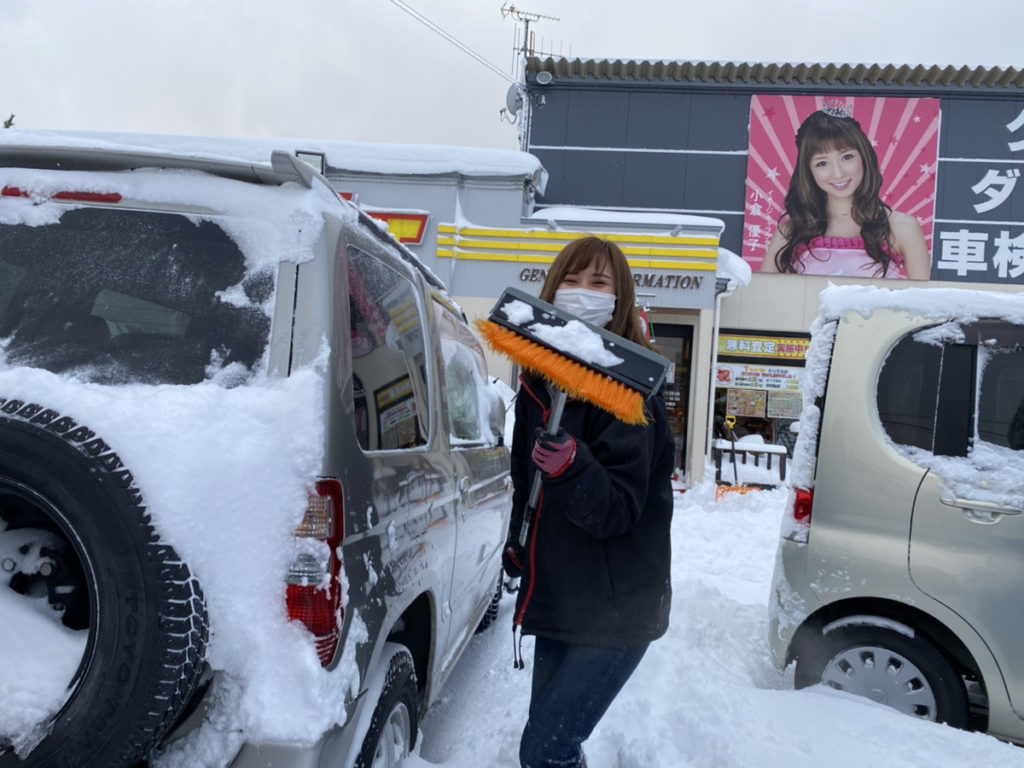 広い展示場には、初売目玉車をはじめ多くの車両が並んでおります。雪片付けの作業は大変ですが、全員一丸となって頑張ります